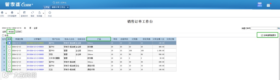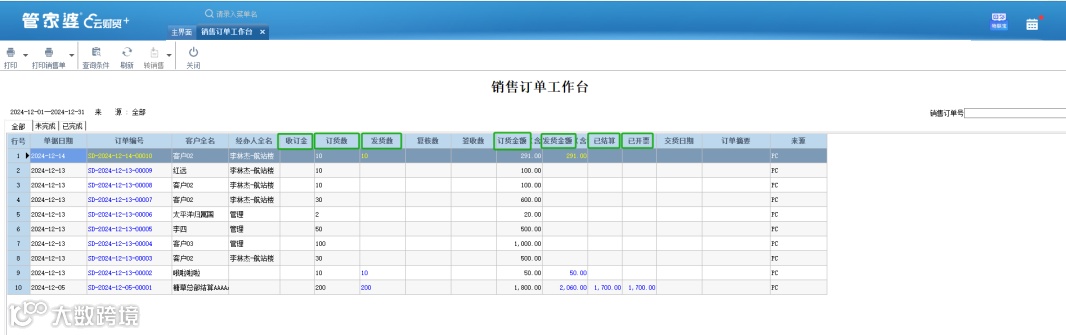 管家婆财贸ERP的销售订单工作台集成了从订货源头到销售开票的全链条跟踪功能,只需一张表,即可清晰展现订货数量、已发货数量、签收情况、收款金额、结算状态及开票状态。全面而详尽的信息展示,不仅让内勤人员能够轻松掌握销售动态,更能在关键时刻迅速响应客户需求,提升客户满意度。