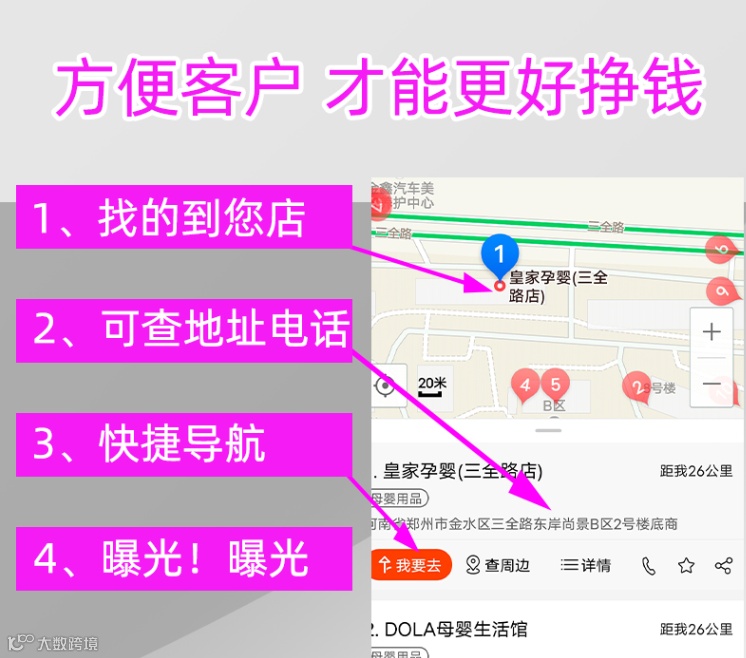在各大地图上标记上店铺名称,客户轻松查找,一键导航到店,可以极大提升店铺曝光率。快看看你家店铺在地图上能搜到吗?