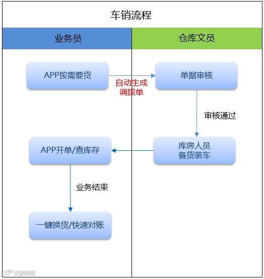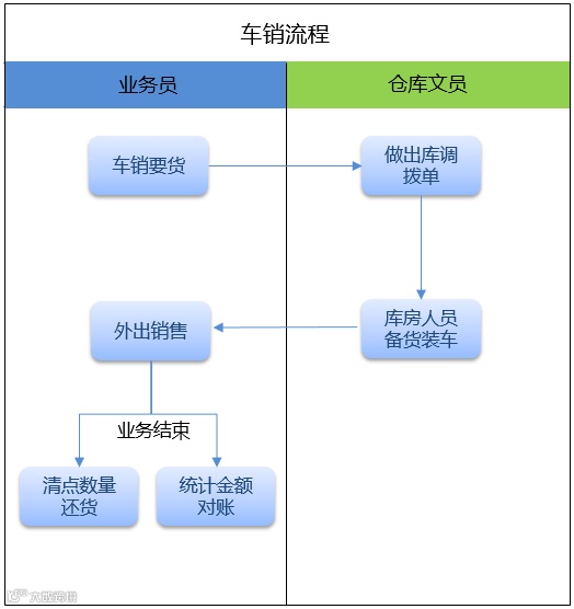 业务员要货装车→仓库人员核对→业务员外出销售抄单→财务处交款对账。