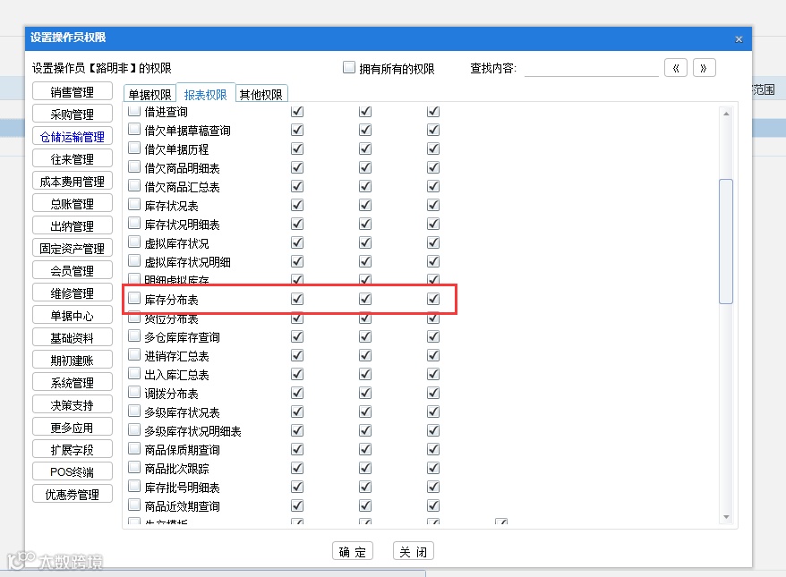 3、如果还是没有,admin登陆软件,操作员权限-仓储运输管理-报表权限-勾选库存分布表权限给对应操作员。