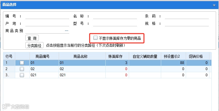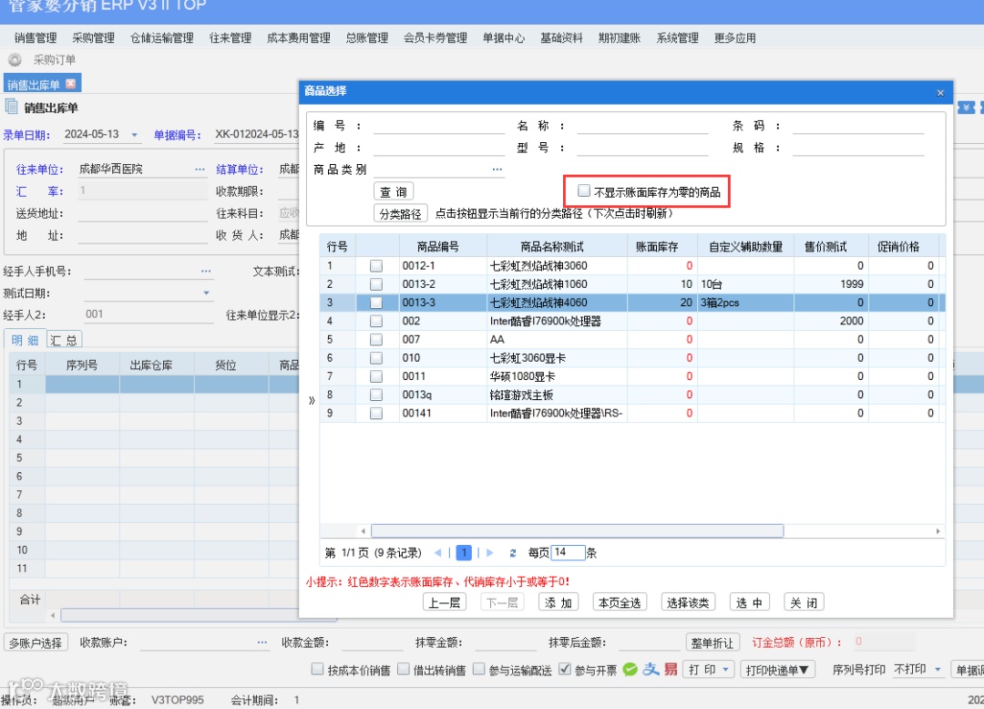 开单商品选择框默认是可以勾选【不显示账面库存为零的商品】这个选项的,勾选了之后就不会显示账面库存为零的商品,便于用户快捷查询商品。如果不显示这个选项应该如何排查呢?