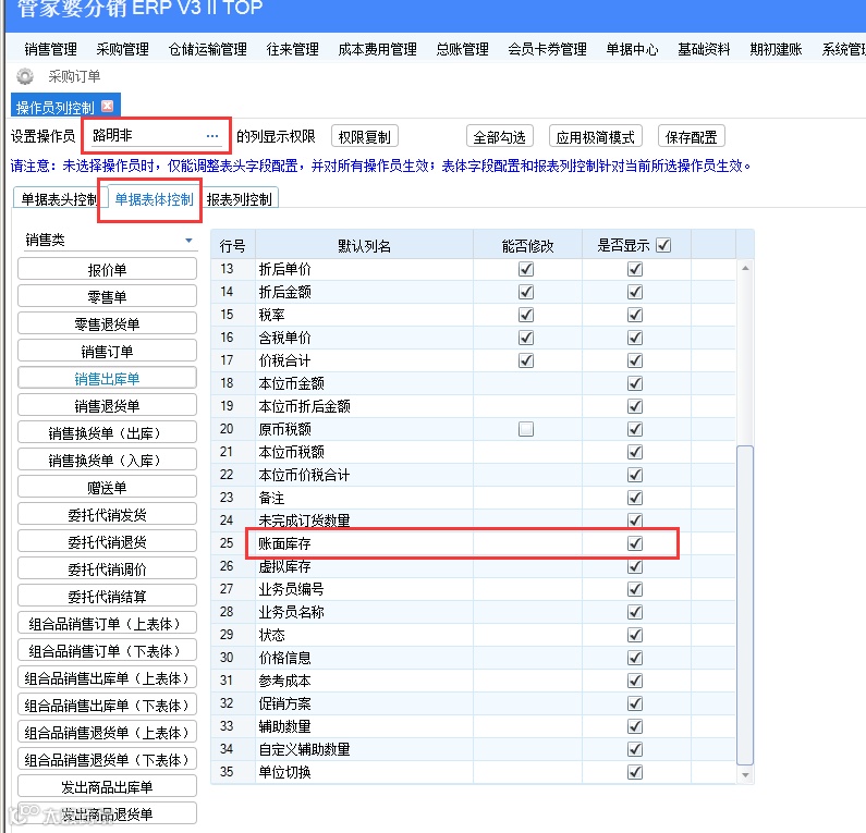 2、普通操作员登录没有该选项,检查单据表体是否有账面库存字段,如果没有,右键增加一列操作确认能否增加显示该字段,右键增加一列没有的话,admin登陆软件-系统管理-单据设置-操作员单据报表列控制-选择操作员,检查对应单据表体字段,检查表体账面库存字段是否显示有没有勾选,该字段勾选以后单据表体增加显示出来再操作选择商品即可。