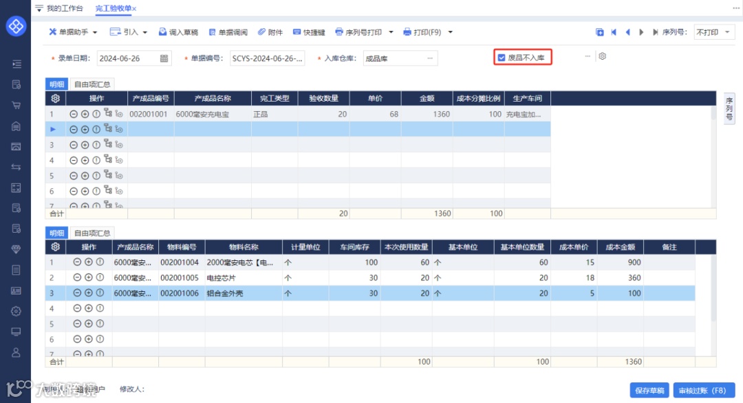 第二步:对产成品进行拆行,然后将“完工类型”调整为“废品”,并录入正品、废品各自的数量。