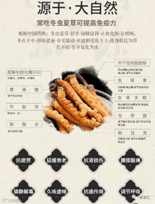 现代医学对冬虫夏草的研究发现:冬虫夏草中含有丰富的核苷类成分、多糖以及很多氨基酸和微量元素,具有很好的身体补益作用和增强免疫力的作用。