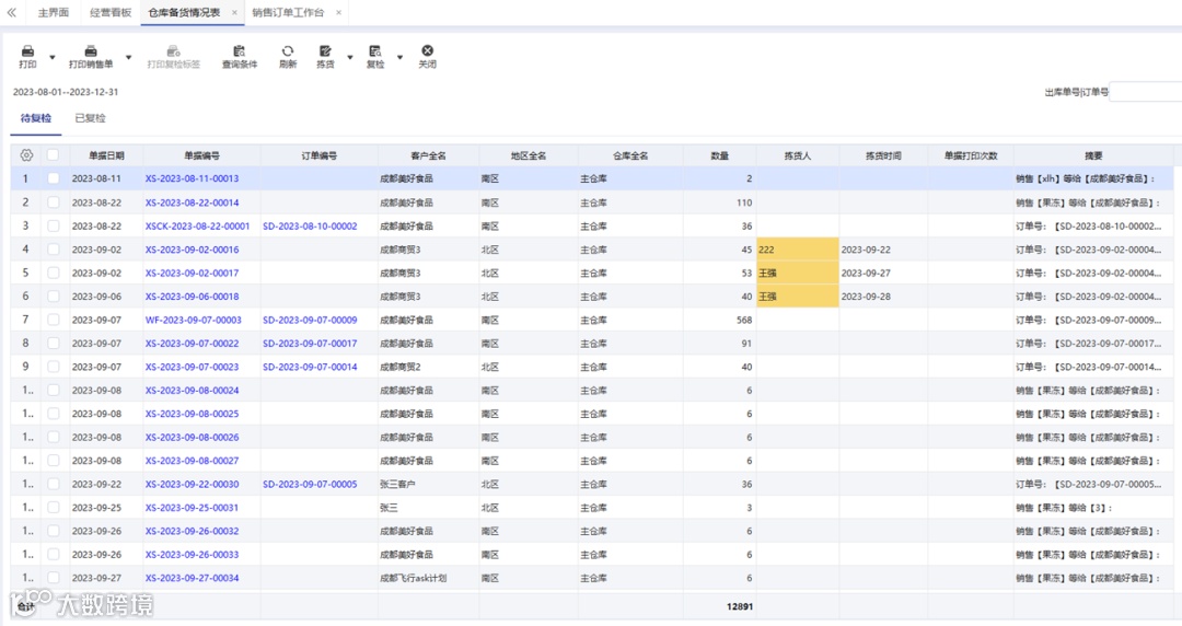 仓库备货情况表,【待复检】页面涉及两个流程:拣货、复检;拣货完成后,会标注一个拣货人;如果仓管员需要快速看到哪些订单已经拣货,是谁完成了拣货,则可以将拣货人非空的单元格标注为【铫煎黄蕊】