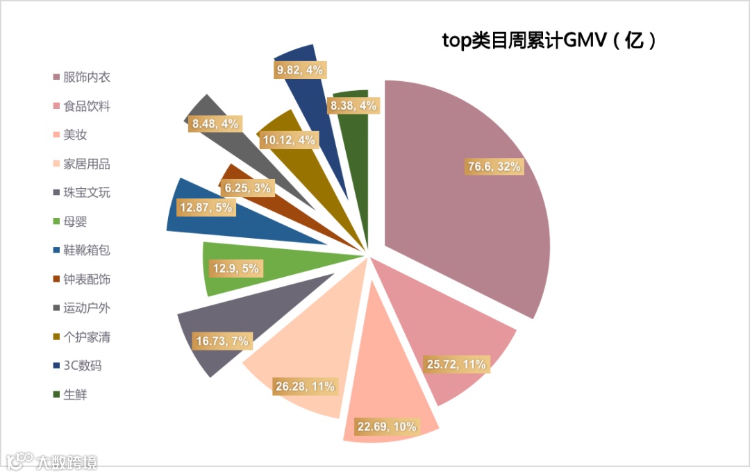 A. 本周对比上周整体大盘数据,预估累计GMV有小幅度下滑,环比下降了8.5%,本周大盘主要类目均有所下滑,个别类目仍有增长。其中,服饰内衣类目GMV下滑量最大,类目降幅为11.8%;食品饮料、母婴和生鲜类目降幅较大,分别下滑了27.8%、31.8%和14.1%;家居用品类目累计GMV较上周减少了2.99亿,占比为10.2%。