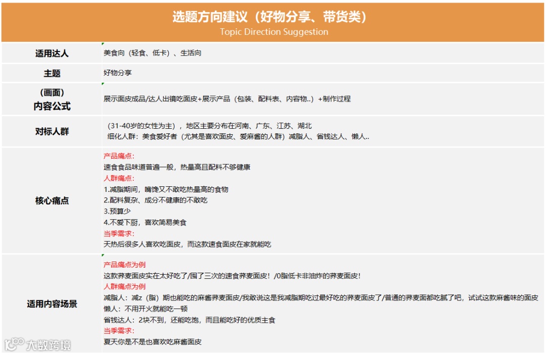 轻食减脂达人——从商品的定位分析是轻食减脂类达人的首选产品,该商品与同类荞麦面在该类型达人下出单数据均不错,该类型达人接受度高,同类品热推达人达到2000+;