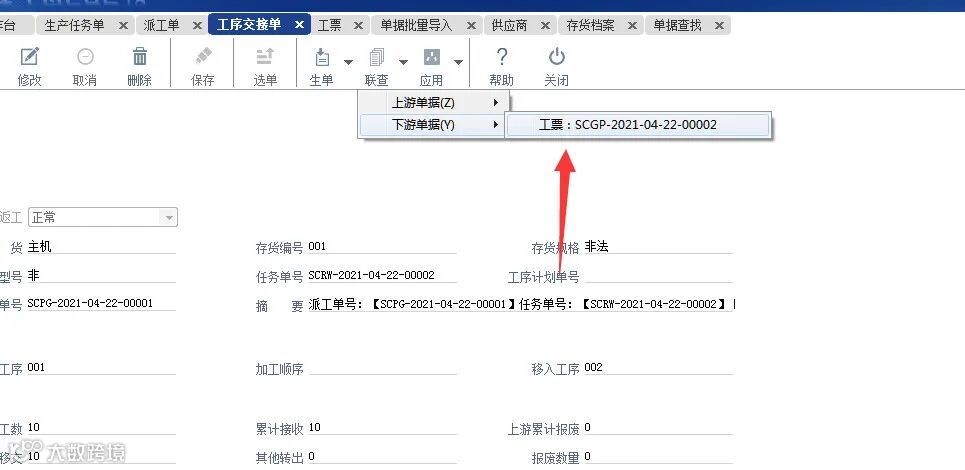 4、在【工序交接单】中点击【联查】--【下游单据】即可看见生成的工。