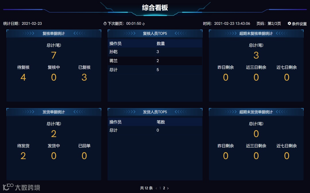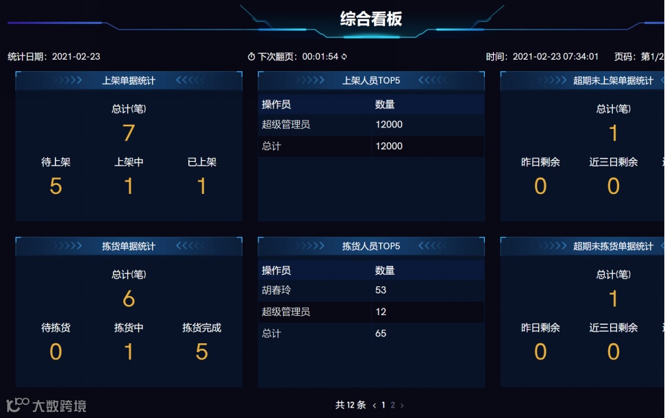 即时统计 上架 · 拣货 · 复核 · 发货 各个业务节点的 单据数量与人员排行