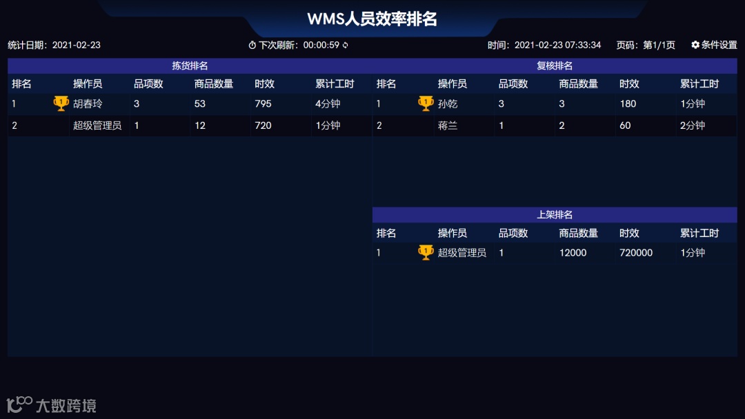 即时统计 拣货 · 复核 · 上架 各个业务节点的人员时效与排行;每个人都能直观了解自己的工作数据。