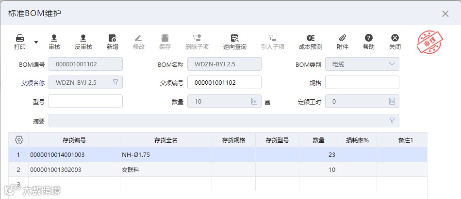 标准BOM也称物料清单,是指产品所需零部件明细及其结构,是由父项存货和子件所组成的产品关系树。物料清单可以是自顶向下分解,或是逆向自底向上跟踪。BOM不仅是MRP系统中重要的输入数据,也是财务部门核算成本,制造部门组织生产等的重要依据。