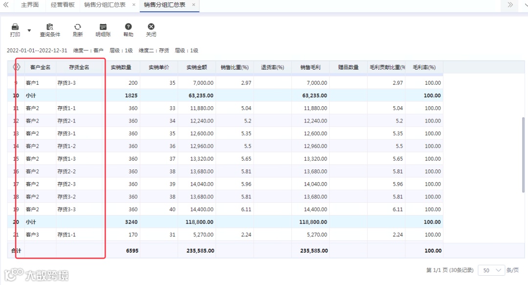 若需对客户的每种存货销售情况的对比分析,只需要通过“客户+存货”的组合查询条件,即可轻松鸥如下报表: