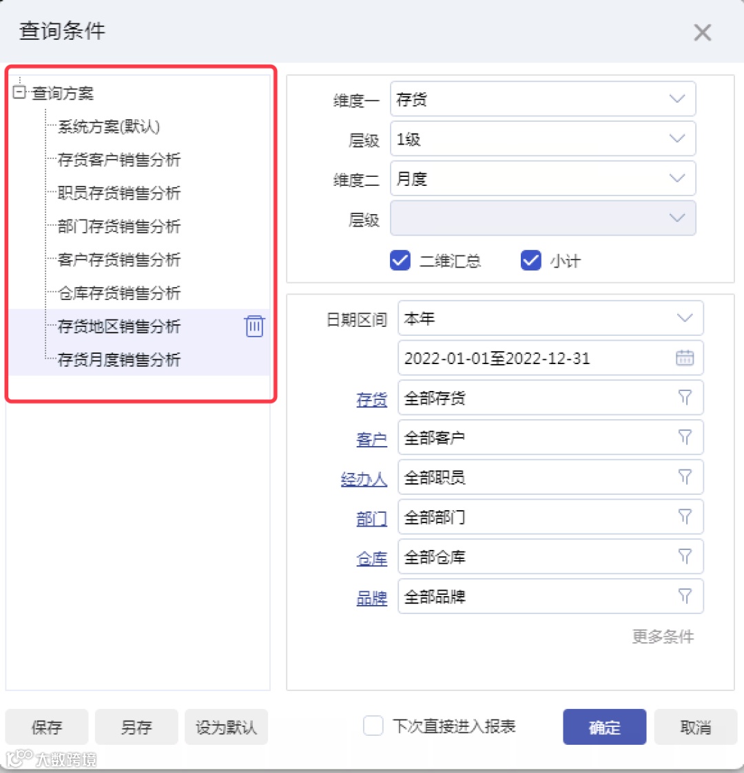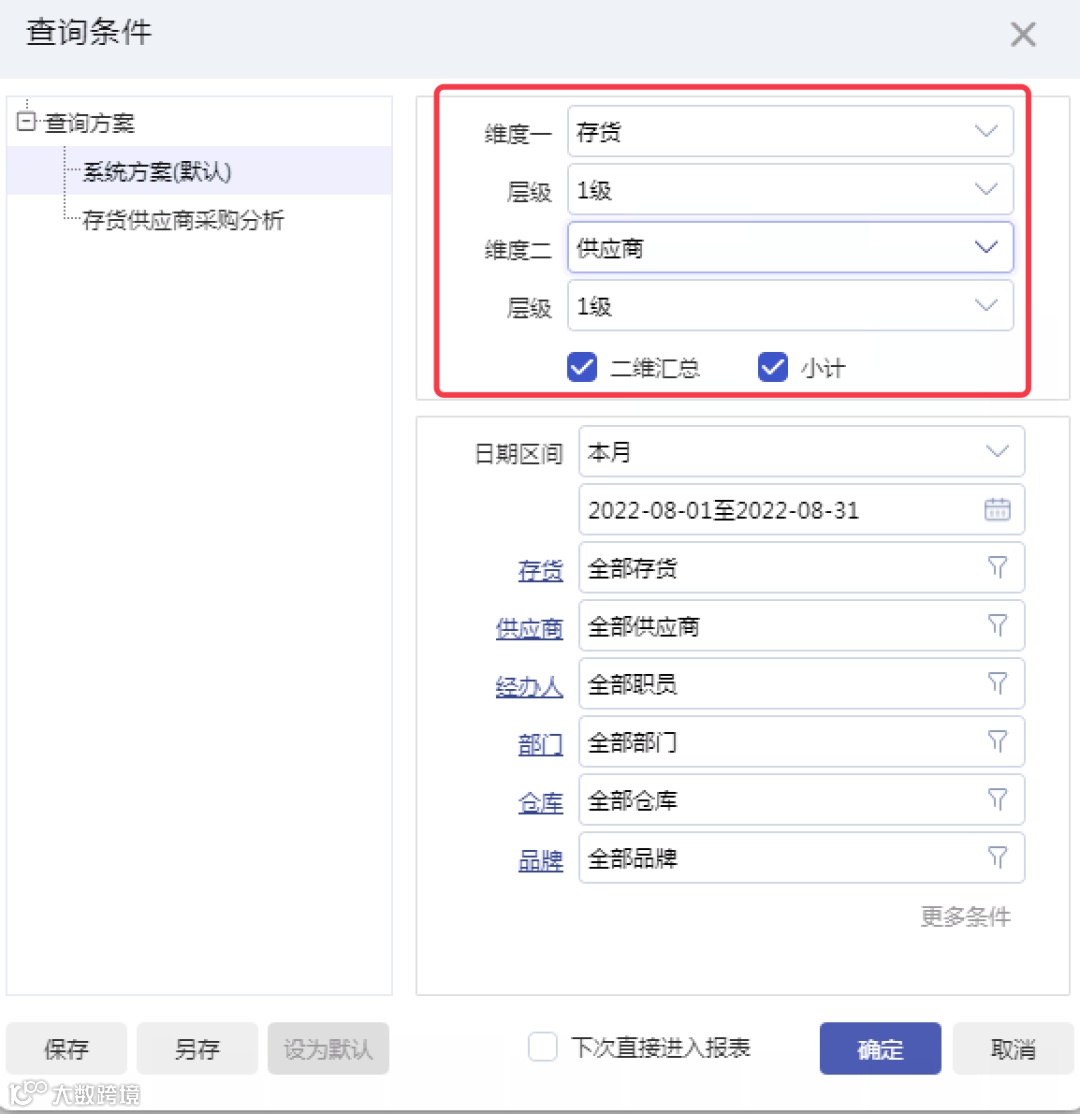 利用【保存查询方案】的方式,可将常用的查询条件保存为固定查询方案,即可获得常用的分析报表,每月只需调用查询方案,就可以快速得到所需的业务数据分析数据。工作效率能得到大幅改善和提高。