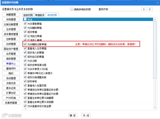 3、普通操作员受“操作员权限—单据中心—其他权限—允许删除过账单据”权限控制,该权限默认是不勾选的。