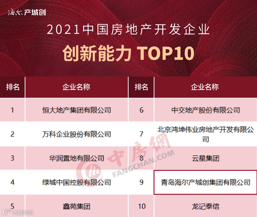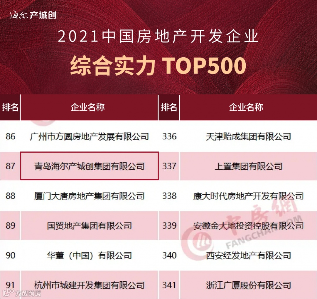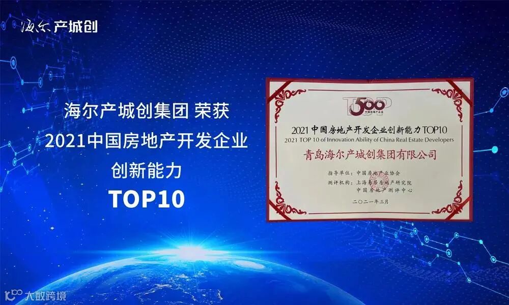 海尔产城创凭借在“生活+科技+服务”物联智慧转型的引领、“产城创生态圈”模式的创新,荣获“2021中国房地产开发企业创新能力TOP10”、“2021中国房地产开发企业综合实力TOP100、第87名”。