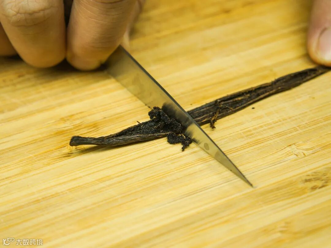 用小刀将香草荚从中间抛开,将香草籽刮出备用(用香草精可忽略此步)。