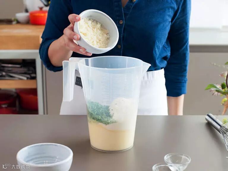 大量杯中继续加入芝士粉、小香葱、面粉、黑胡椒碎和盐,搅拌均匀。