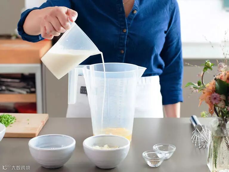 在大量杯中加入鸡蛋液、牛奶和融化的黄油,搅拌均匀。