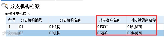 先对分支机构设置对应客户和对应供货商。例如:01机构对应01客户和01供货商;02机构对应02客户和02供货商。
