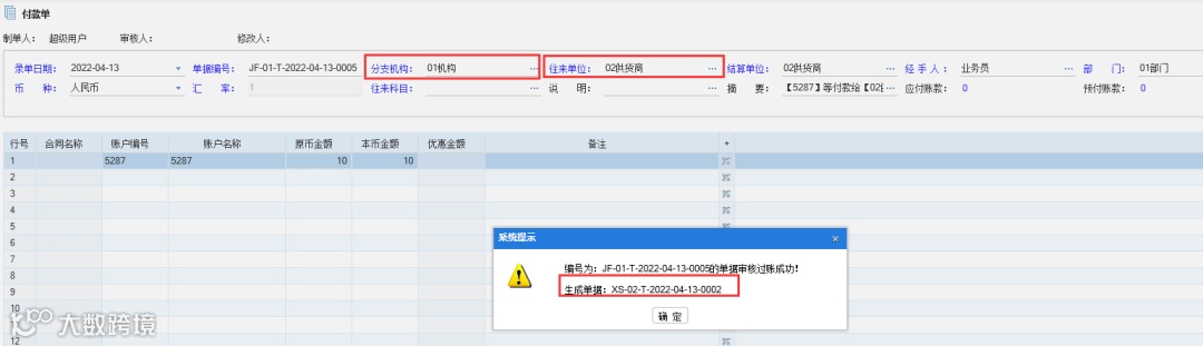 做一张付款单,分支机构选择01机构,往来单位选择02机构所对应的02客户,过账之后就会自动生成02机构的的收款单草稿,往来单位是01机构所对应的01供货商。去业务草稿里面找到收款单,录入经手人、部门等信息,过账收款单即可。