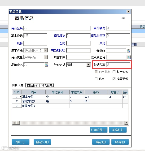 商品信息里双击打开某个商品,如截图设置对应商品的默认税率17;