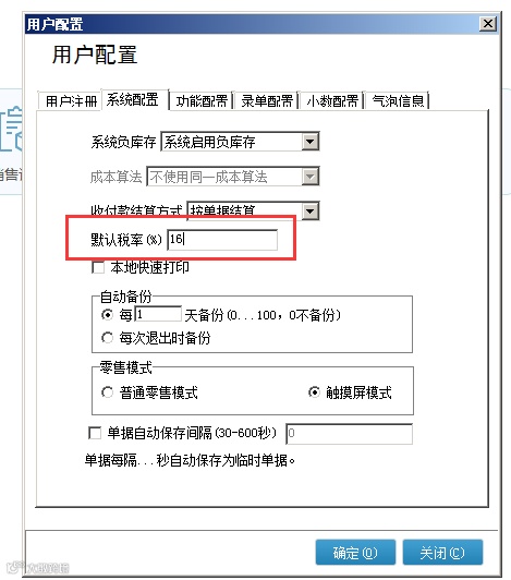 用户配置:系统维护——系统管理——用户配置——系统配置里,可以设置所有商品的默认税率;设置后点击确定,然后重新登录一下;