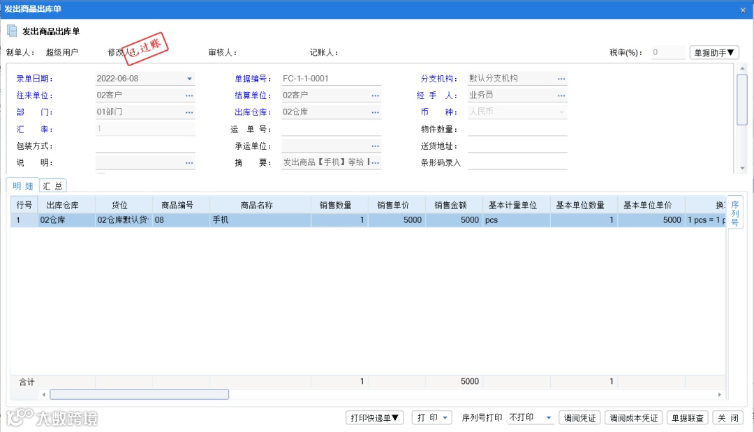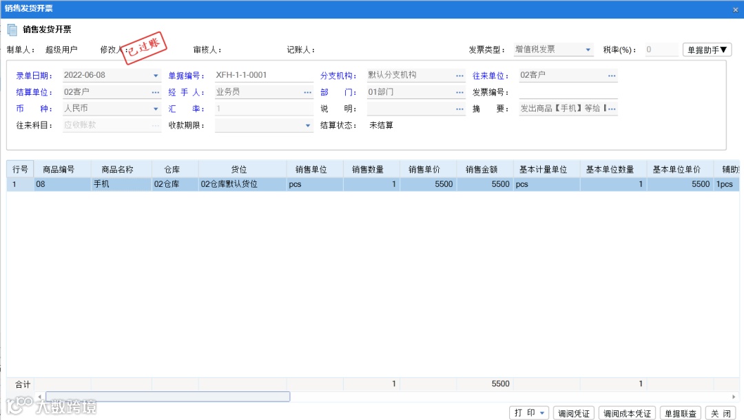 2、开出销售发票前往:往来管理-发票管理做销售发货开票,销售发货开票过账之后【应收合计】项目增加销售发货开票的金额,【发出商品】项目减少商品的成本金额,【利润】项目增加商品的开票金额减去成本金额。