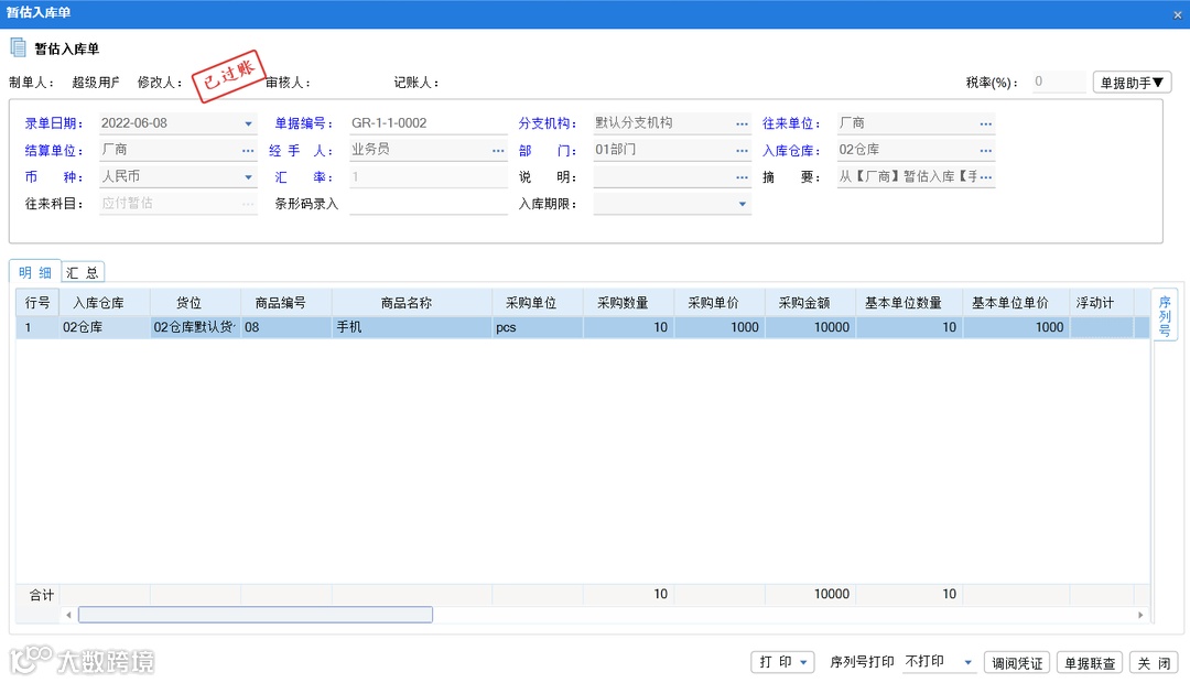 1、货已到发票未到前往:采购管理-暂估管理做暂估入库单。例如:截图中的采购数量是10,采购单价是1000,采购金额是10000;暂估入库单过账之后影响【库存商品总值】和【应付暂估】项目分别增加10000。