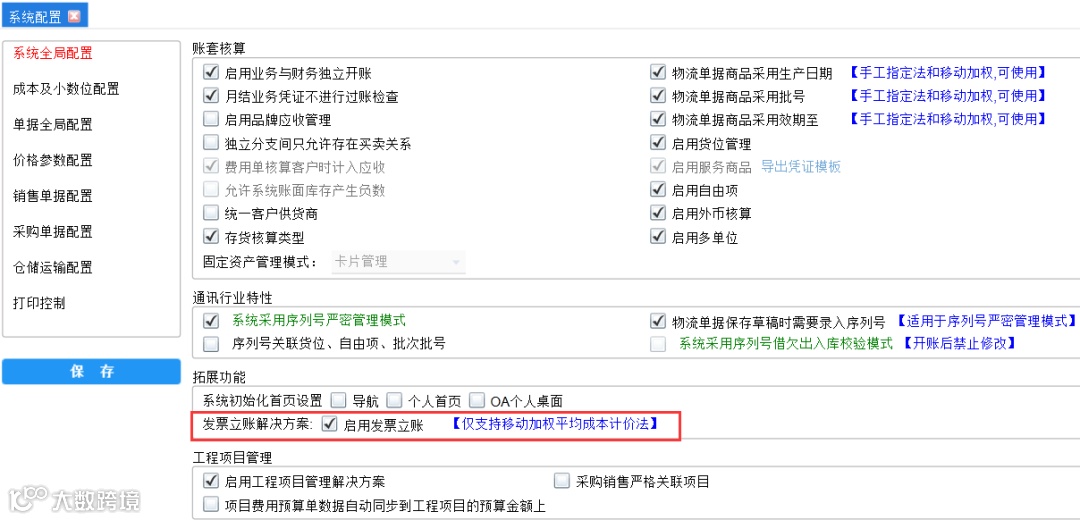 注:只有移动加权平均成本算法才支持启用发票立账功能。