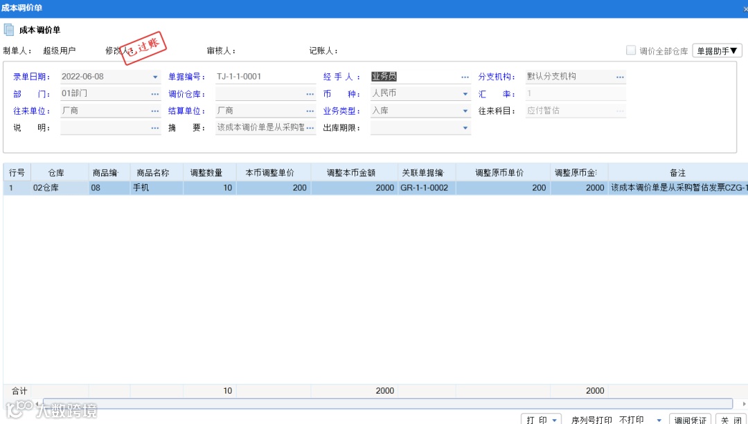 2、收到发票后前往:往来管理-发票管理做采购暂估开票,例如:截图中的开票数量是10,开票单价是1200,开票金额是12000;采购暂估开票过账之后【应付合计】增加12000,同时会生成一张成本调价单,商品的成本金额会增加2000,【应付暂估】减少10000。