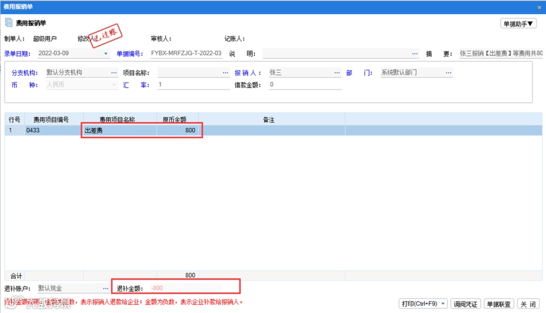 直接做费用报销单,费用项目选择【出差费】,金额800元。表尾自动计算出退补金额-800元,表示企业需要支付【张三】800元。