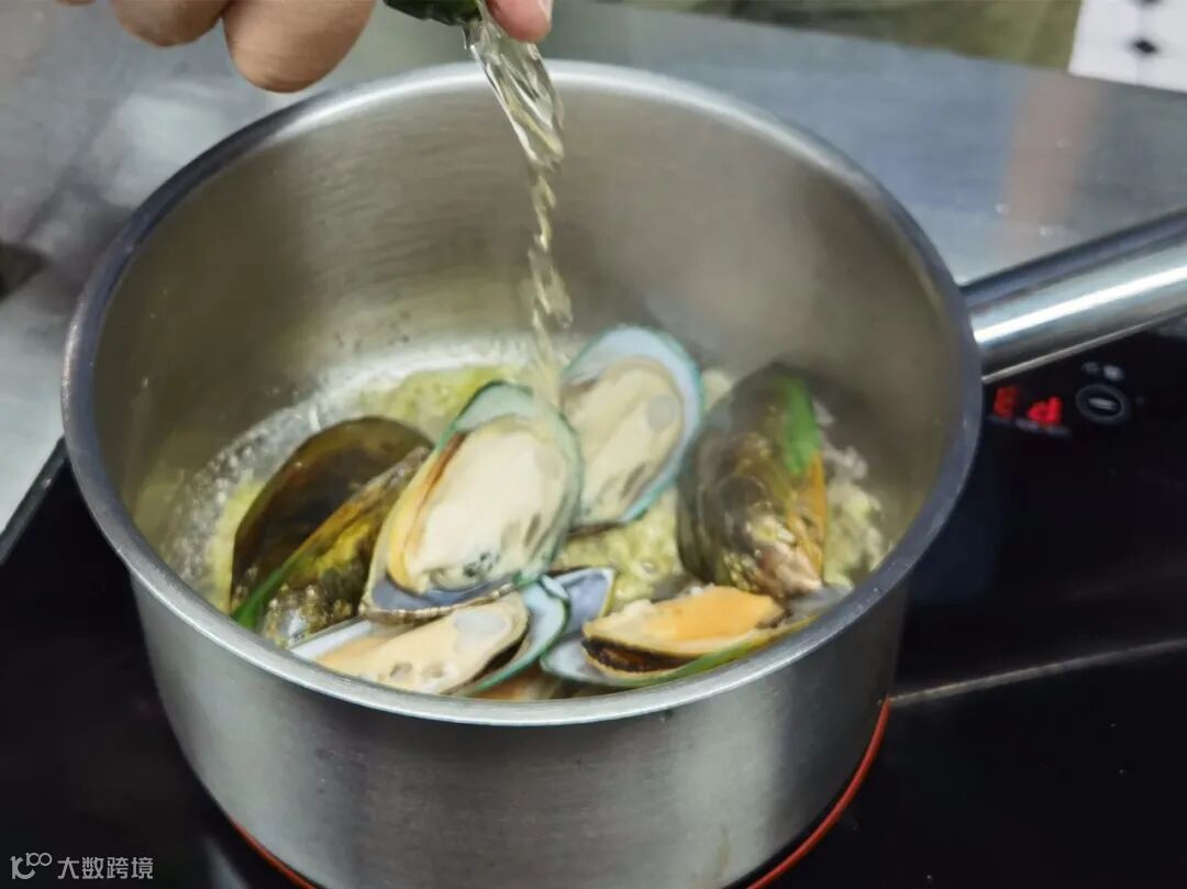 2. 锅中加入贻贝转大火,同时加入白葡萄酒煮10秒挥发酒精。