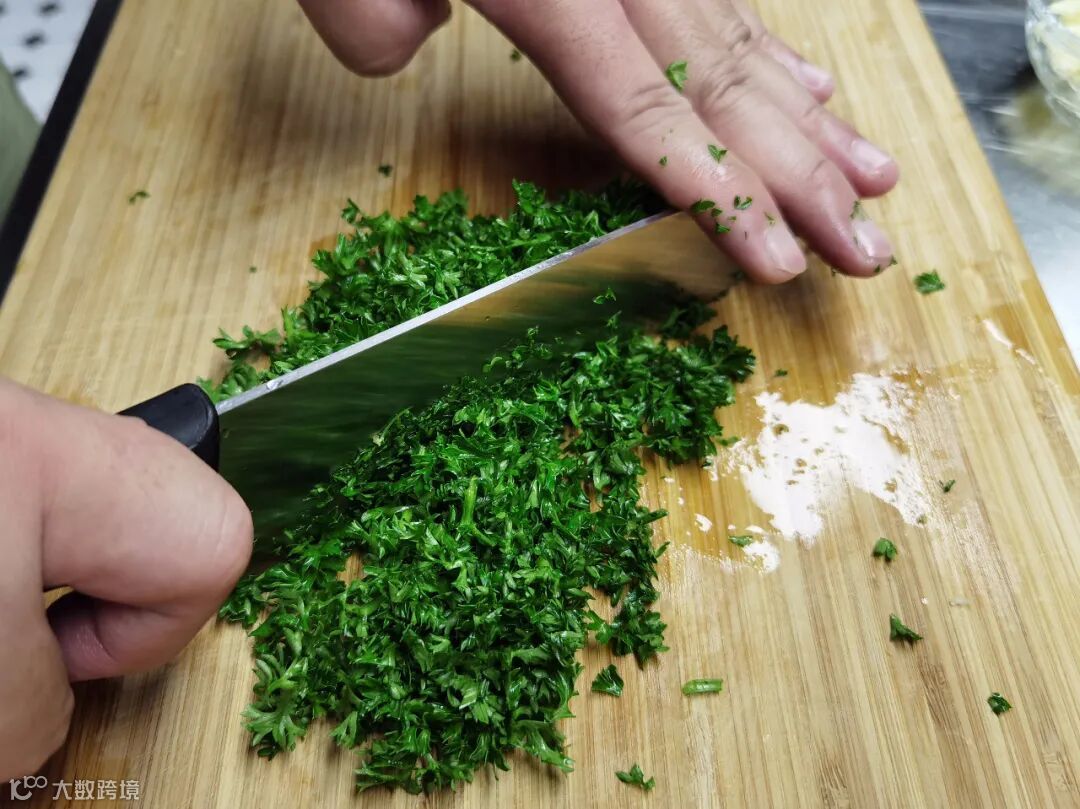 2. 新鲜法香去梗洗净、控水后切碎备用。