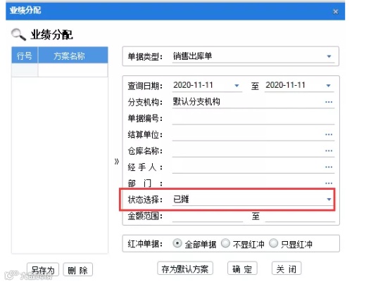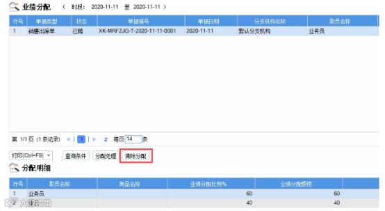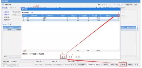 在比例一列输入需要分配给此职员的业绩占总金额的比例,总计是100%即可,最后点击保存按钮,提示数据保存成功,点击确定—然后点击单据上的关闭按钮,这张销售出库单就分配业绩完成。