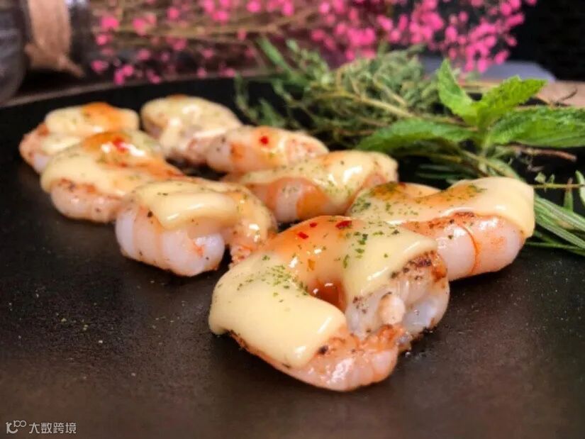 虾仁撒少许黑胡椒,干酪片一切四,盖到每个虾仁上,转小火加热至干酪融化。