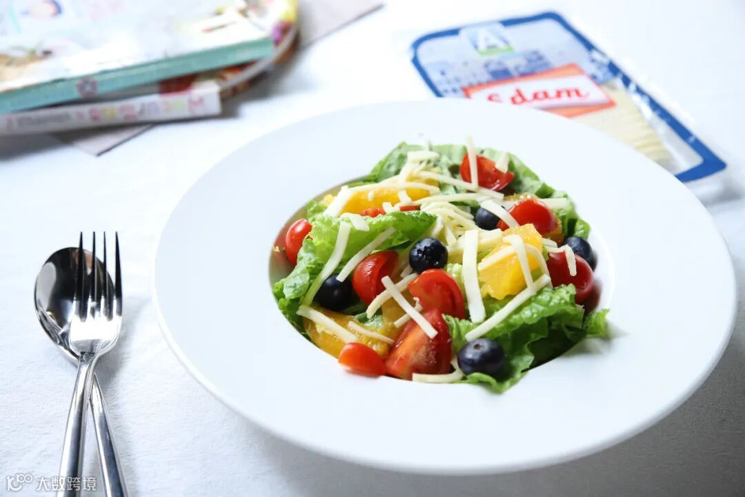 放入小番茄、橙子果肉、伊顿干酪片条即可。