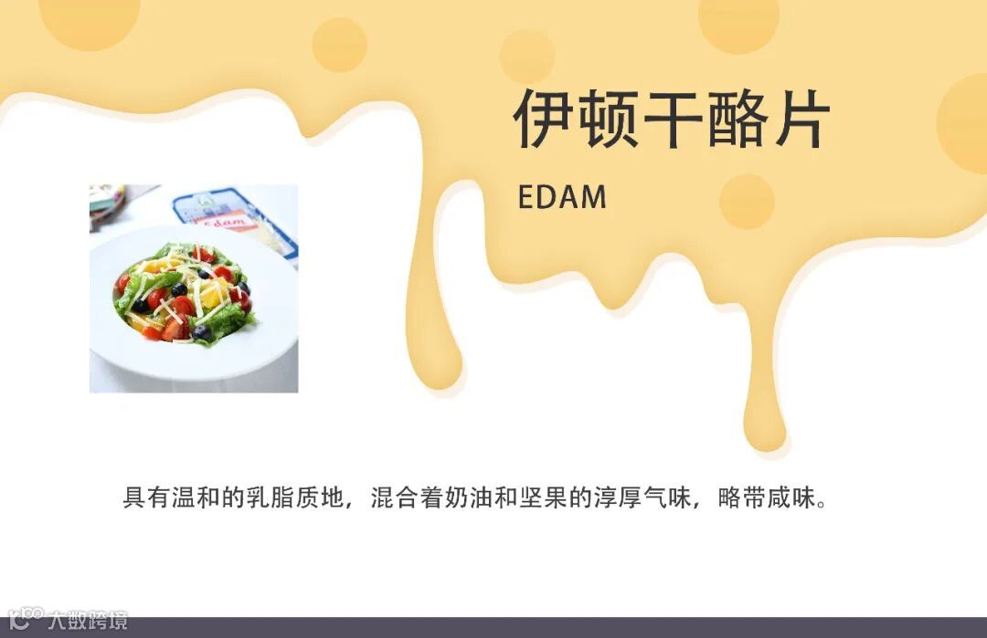 伊顿干酪同样是荷兰经典的干酪品种,它质地温和,风味醇厚。可制成宴会点心、也可直接加入沙拉中,也可搭配烟熏火腿制成三明治,非常适合与梨、樱桃、苹果等水果搭配食用。