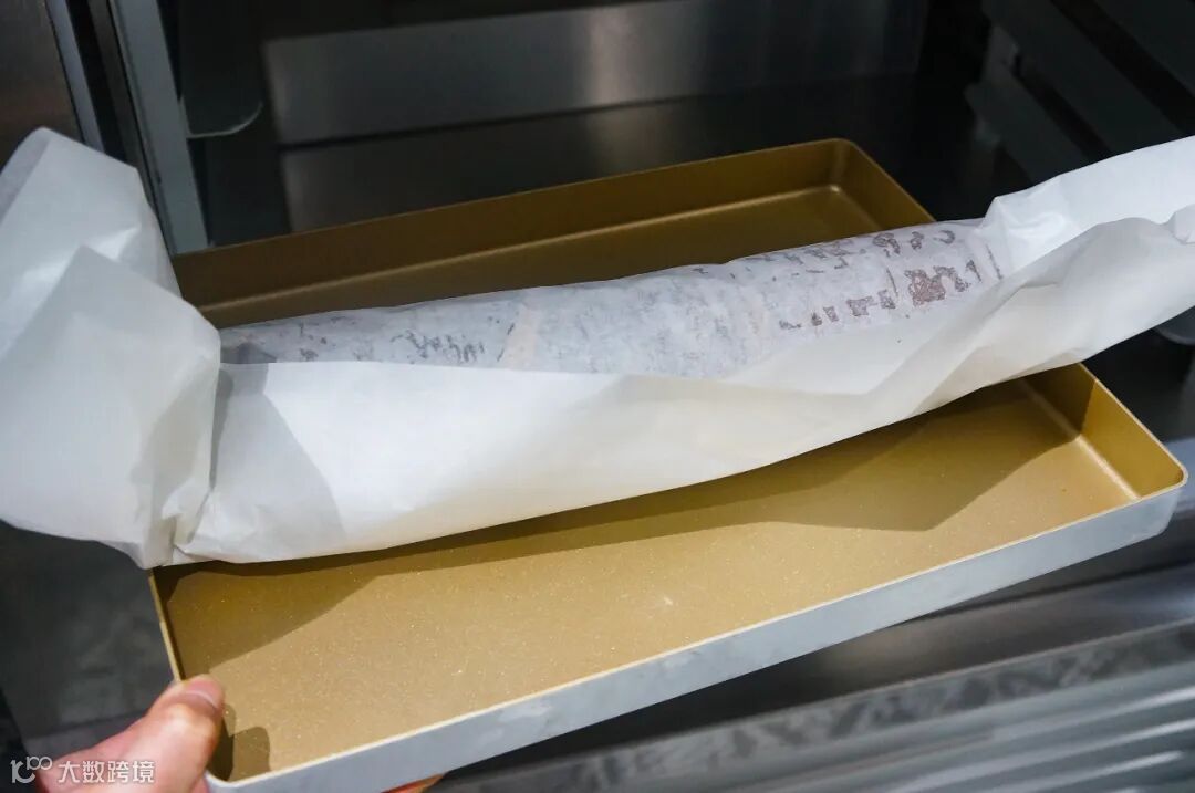 3.拎起靠自己这一端的烘焙纸,借助擀面杖,将蛋糕卷起。放入冰箱冷冻一晚,直至完全冻硬。