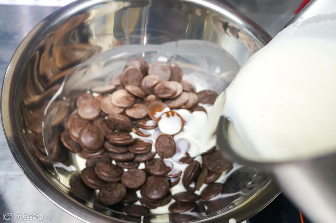 2.将煮沸度淡奶油倒入装有黑巧克力的碗中,静置一分钟,使巧克力充分融化。