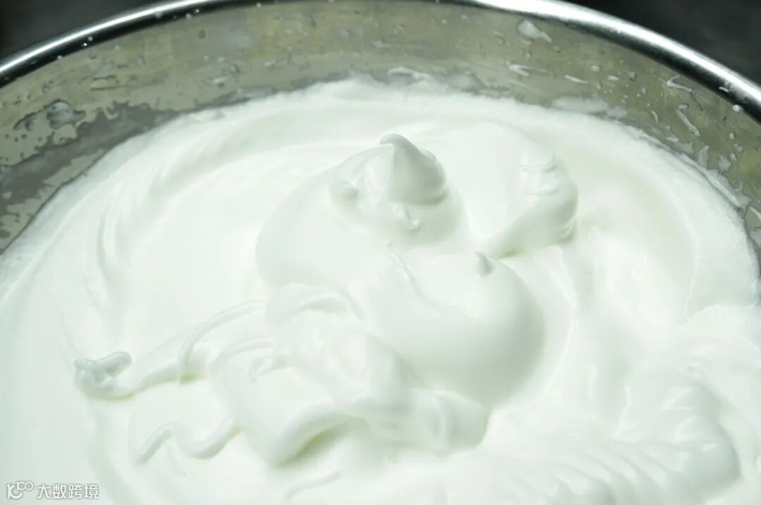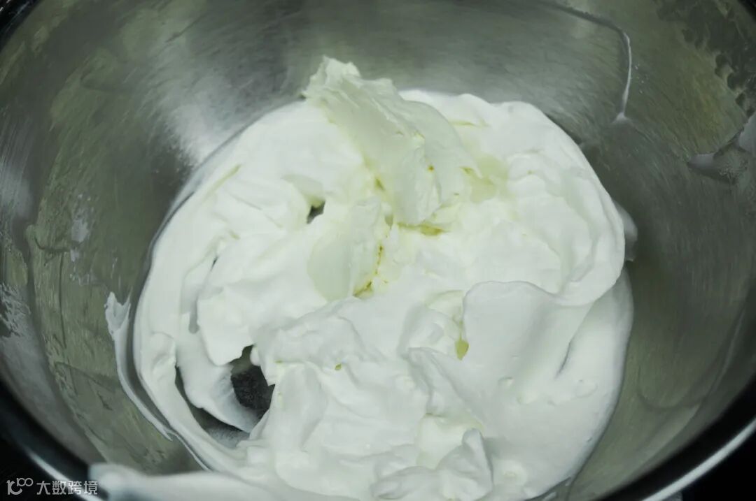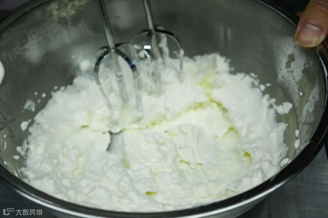 2.用电动打蛋器将淡奶油与幼砂糖打发到9成发。