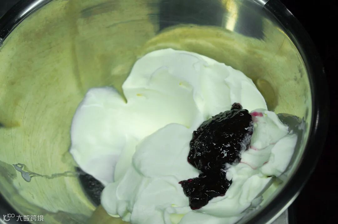 5.另一份奶油中加入蓝莓果酱,用电动打蛋器充分混合均匀。装裱花袋,备用。