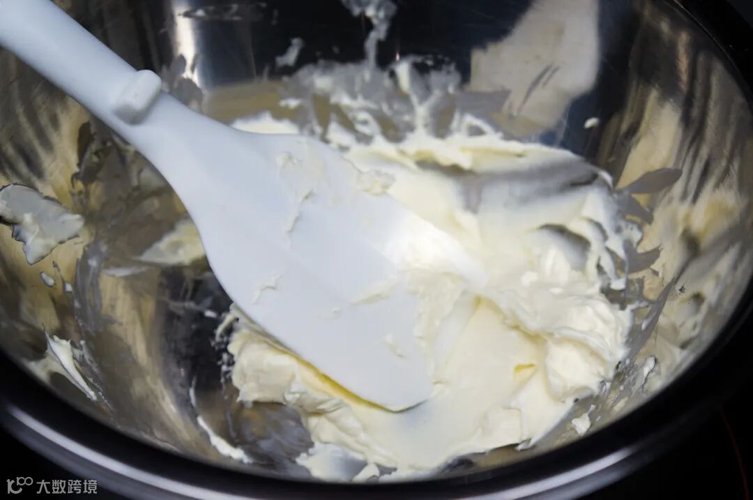 1.将奶油奶酪隔水软化,用手动打蛋器充分打软,备用。