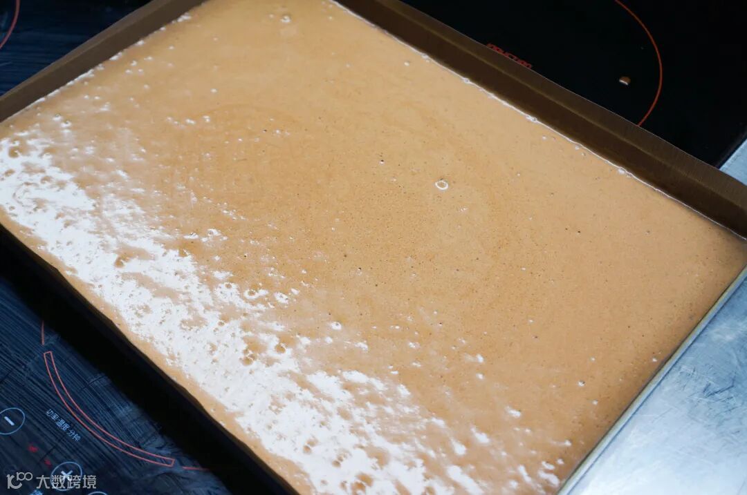 7.将面糊倒入烤盘中,用刮板刮平表面。