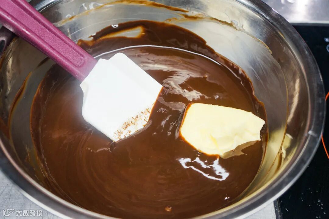 4.将黄油放入搅拌均匀的巧克力甘纳许中,用手动打蛋器混合均匀,备用。如果甘纳许太冷,可以适当隔水加热,便于融化黄油。