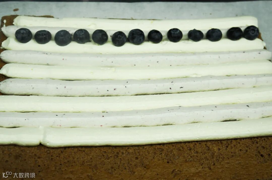 2.将两种奶油交替挤在蛋糕上,注意不要挤满,留1/3用来卷。在靠自己这一侧的1/3处放上一排蓝莓。