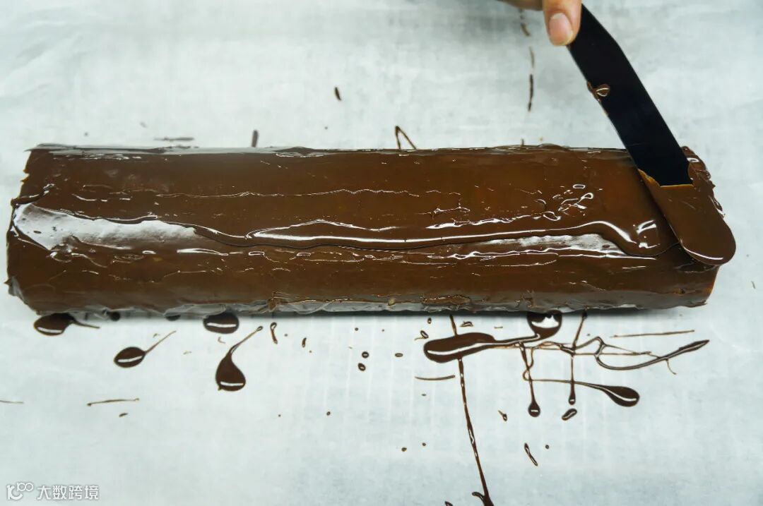 4.将冻硬的蛋糕卷取出,用抹刀将30度的甘纳许抹在蛋糕卷表面,形成树干的纹路。