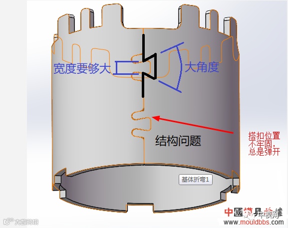 我们公司的卷圆疑也是在1.5米高地方坠落不开口。我觉得你这燕尾角度太小了,不知道可否改。我们在燕尾和本体边缘还打方形凸包。