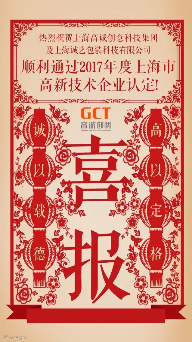 导读:热烈祝贺上海高诚创意科技集团及上海诚艺包装科技有限公司顺利通过2017年度上海市高新技术企业认定!