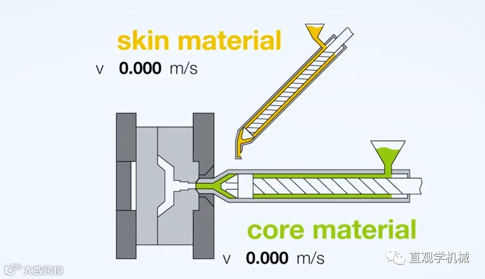 skinmelt 工艺需要在注射前熔化两种熔体。表层的原生材料首先到达型腔,在涌入的再生PP的推动下,表层材料压贴在型腔壁上,同时,回收材料填充芯层。积聚在芯层的回收材料量,主要取决于成型部件的形状以及材料在型腔中的流动模式。表层材料和芯材的注射位置选择以及相对黏度,都对结果具有重大影响。