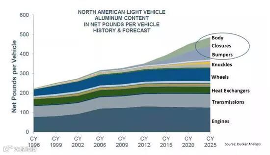 ▲铝合金车身部件需求逐年增高(ducker analysis)